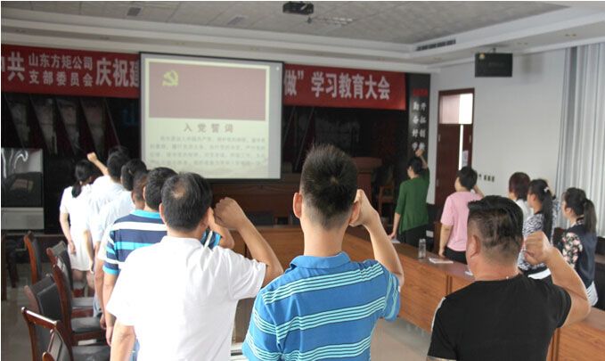 7月1日,中共山東方矩建筑安裝有限公司黨支部組織召開了慶祝建黨95周年暨“兩學一做”學習教育大會,會上大安鎮(zhèn)組織辦董濤同志給公司全體黨員上黨課,踐行兩學一做學習教育主題活動深入開展;并票決通過預備黨員轉正決議,全體黨員及入黨積極分子面向黨旗,莊嚴宣誓《入黨誓詞》。公司黨員及入黨積極分子和全體員工共同觀看黨的群眾路線教育專題片——《生命線》。