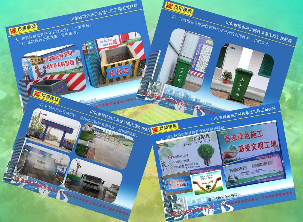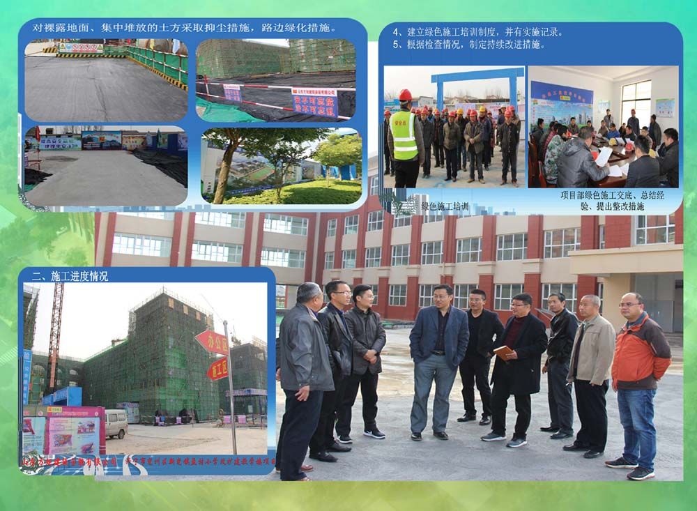 公司在推廣綠色施工科技示范工程中,嚴格按照山東省建設工程標準《建筑與市政工程綠色施工評價標準》GB37/T5087-2016有關規(guī)定進行科學管理施工,遵循因地制宜、四節(jié)一環(huán)保的原則,結合工程的建設規(guī)模、揚塵治理、環(huán)境整治、基礎設施資源、文明城市創(chuàng)建和企業(yè)文化等特點,依據(jù)施工管理、環(huán)境保護、節(jié)材與材料資源利用、節(jié)水與水資源利用、節(jié)能與能源利用、節(jié)地與土地資源保護、技術創(chuàng)新與推廣應用等七大要素進行綜合評價,對每一步驟、每一環(huán)節(jié)的施工管理,始終踐行綠色施工的新理念,增添創(chuàng)建科技示范工程的新元素,為迎接省市區(qū)專家組領導的檢查指導階段性驗收打下良好的堅實基礎。